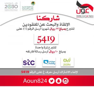 طريقة التبرع : إرسال رسالة نصية SMS بالرقم ( 1 ) إلى 5419 ب 12 ريال شهرياً