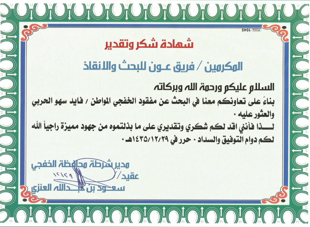 بناء على تعاونكم في البحث عن مفقود الخفجي المواطن / فايد سهو الحربي والعثور عليه.